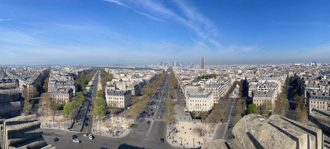 Boven aangekomen hebben we een prachtig uitzicht. De lucht is ontzettend schoon voor Parijse begrippen en we kunnen heel ver kijken. In het westen zien we het kantorendistrict La Défense.
